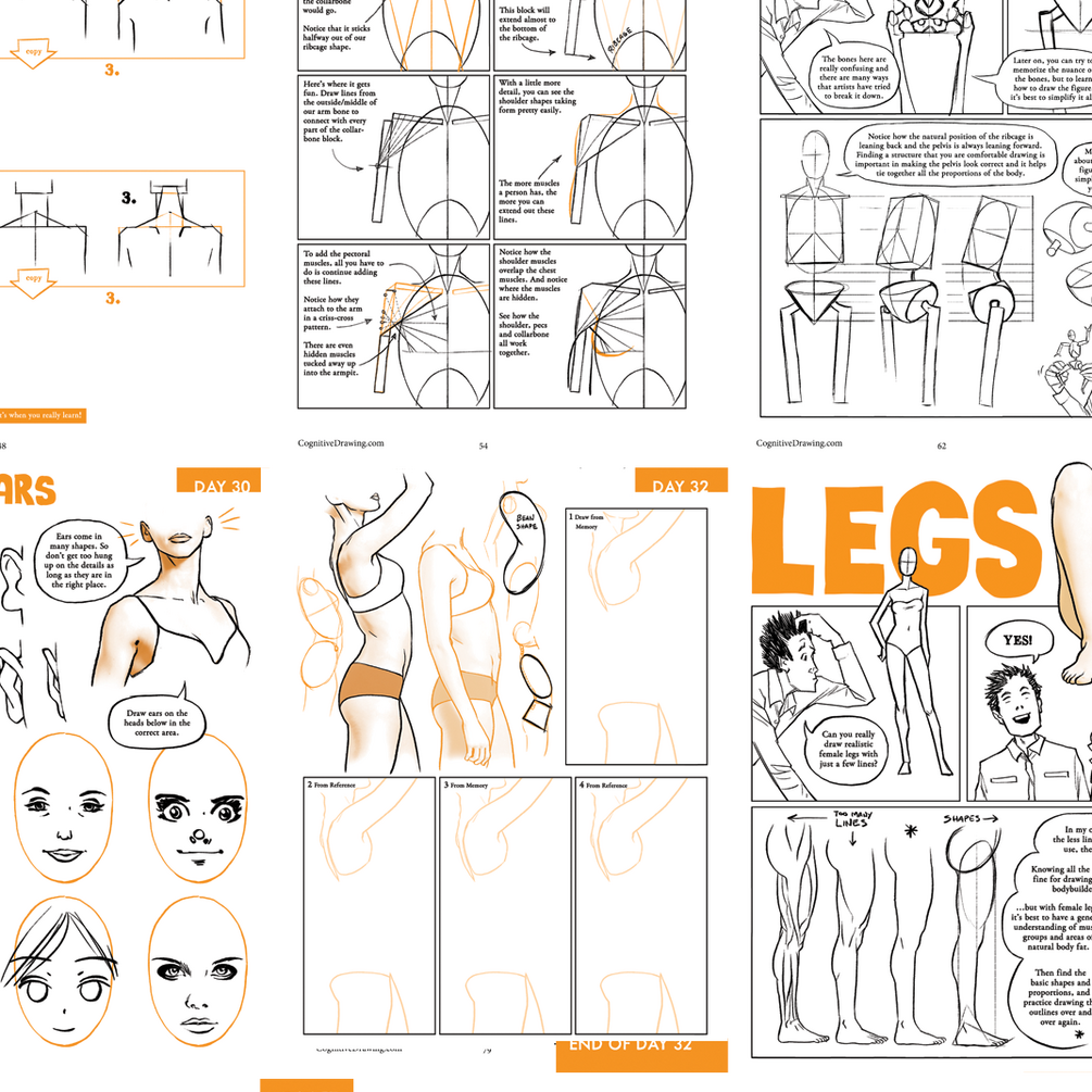 There are 90 Days of lessons (160 pages) in this workbook designed to be printed out and completed at your own pace (preferably daily). In addition to Cognitive Drawing exercises there are many tutorials about the female figure. This book mainly focuses on learning anatomy of a female but the technique can be applied to learning any style.
