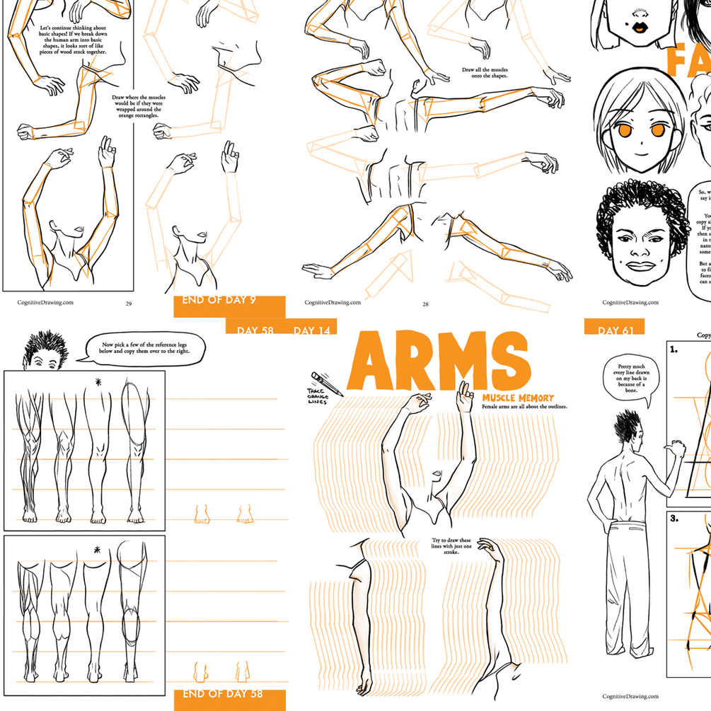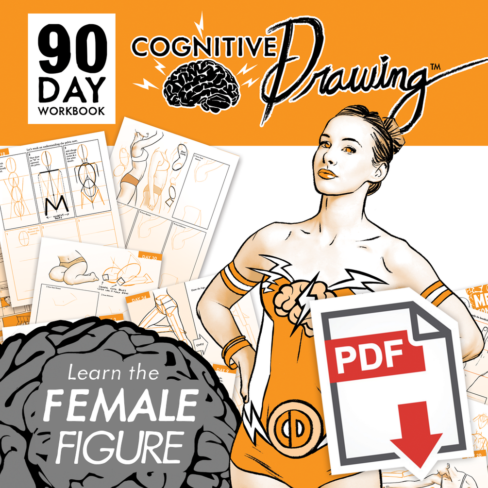 There are 90 Days of lessons (160 pages) in this workbook designed to be printed out and completed at your own pace (preferably daily). In addition to Cognitive Drawing exercises there are many tutorials about the female figure. This book mainly focuses on learning anatomy of a female but the technique can be applied to learning any style.